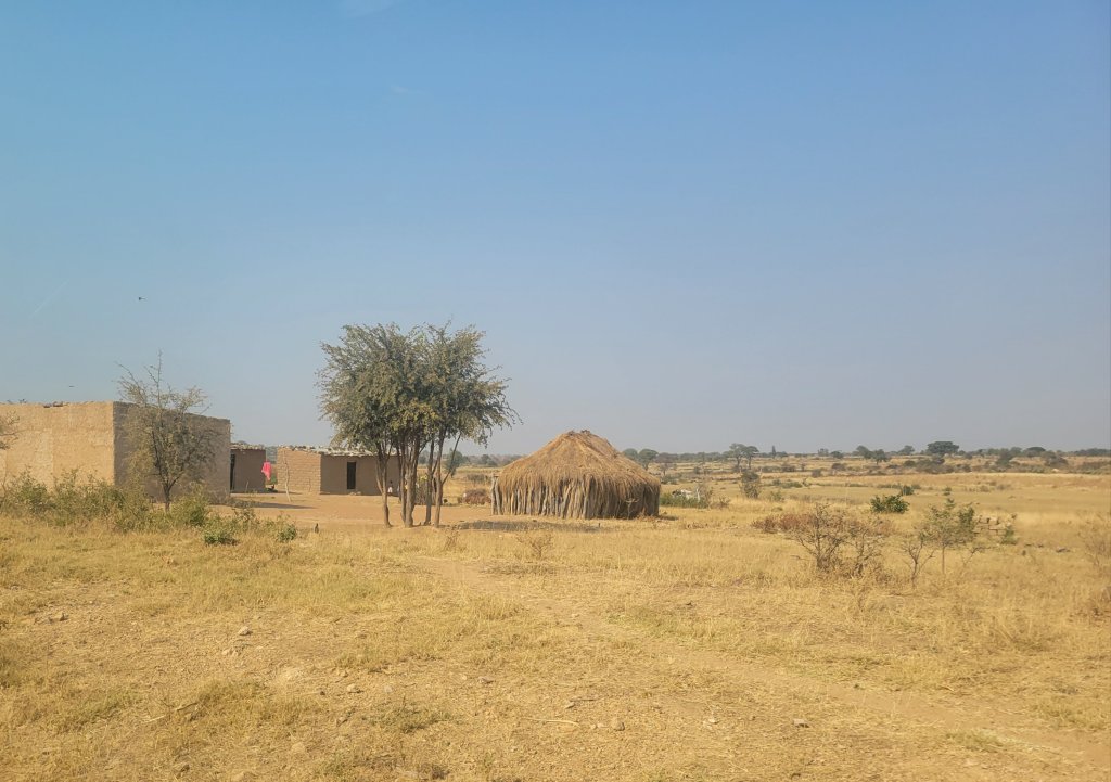 It is winter, the dry season. There are trees and shrubs that are green, but the grass and most of the brush and shrubs are brown. Dust and smoke are in the air, so there is a haze in the air, sometimes more, sometimes less but always there.
