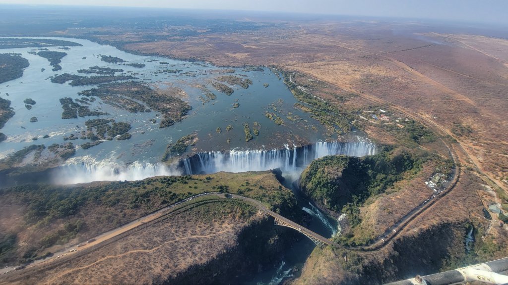 From Zimbabwe, we viewed from above in a helicopter to see the full expanse.