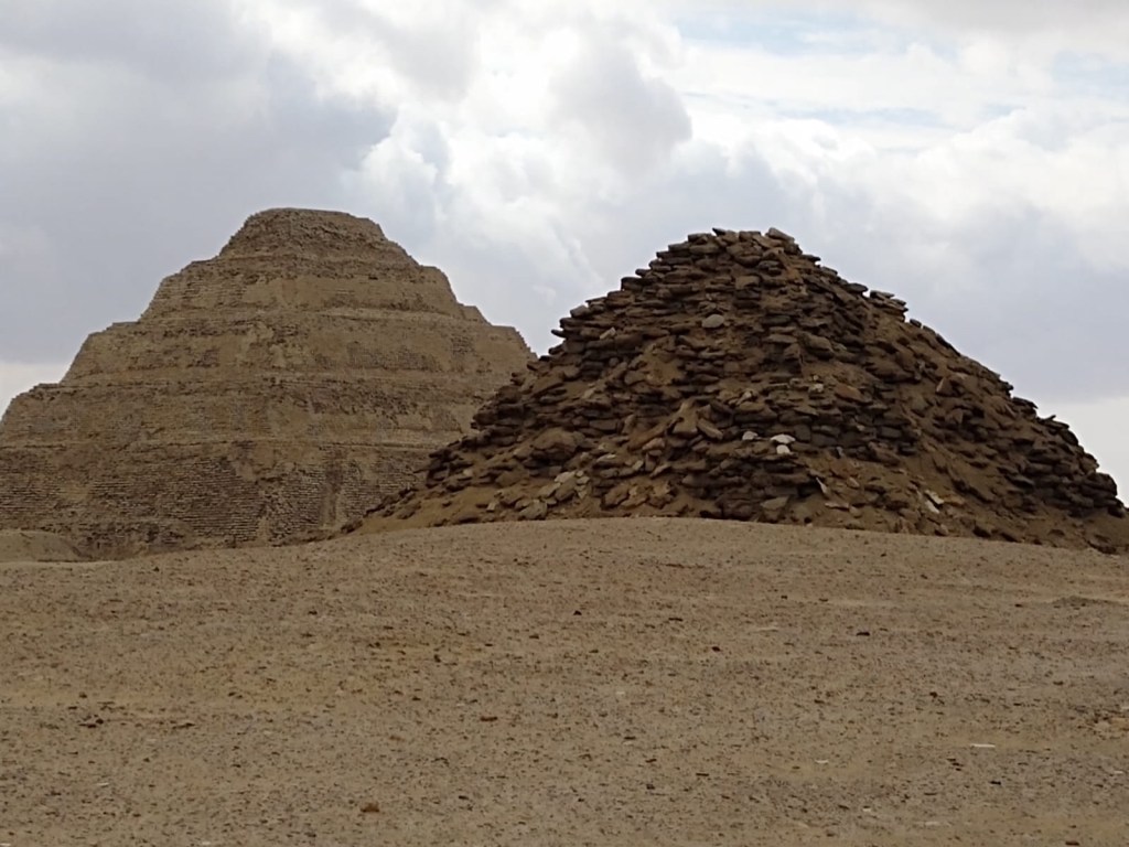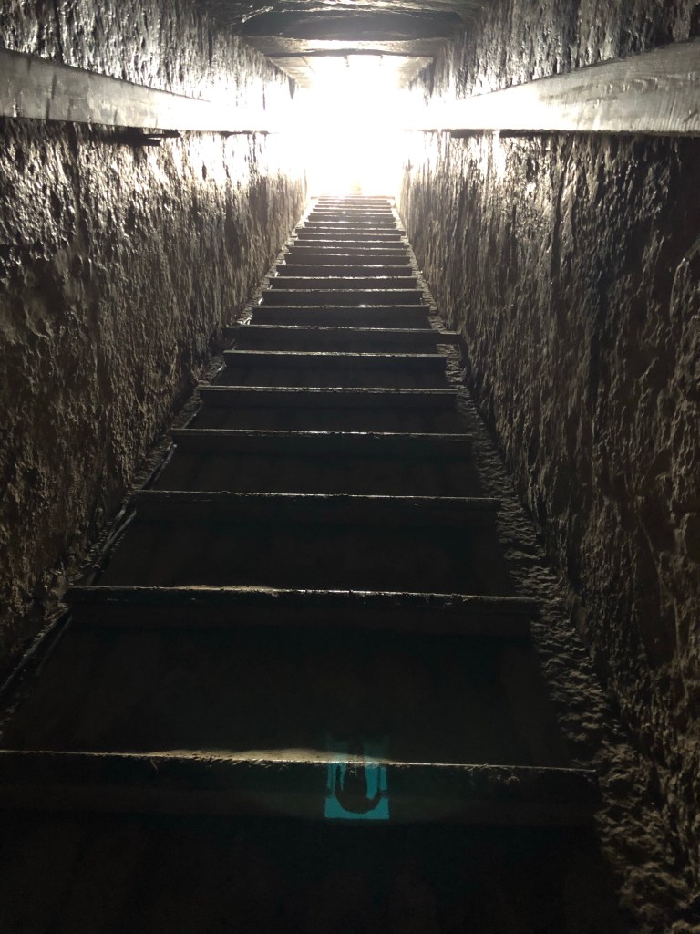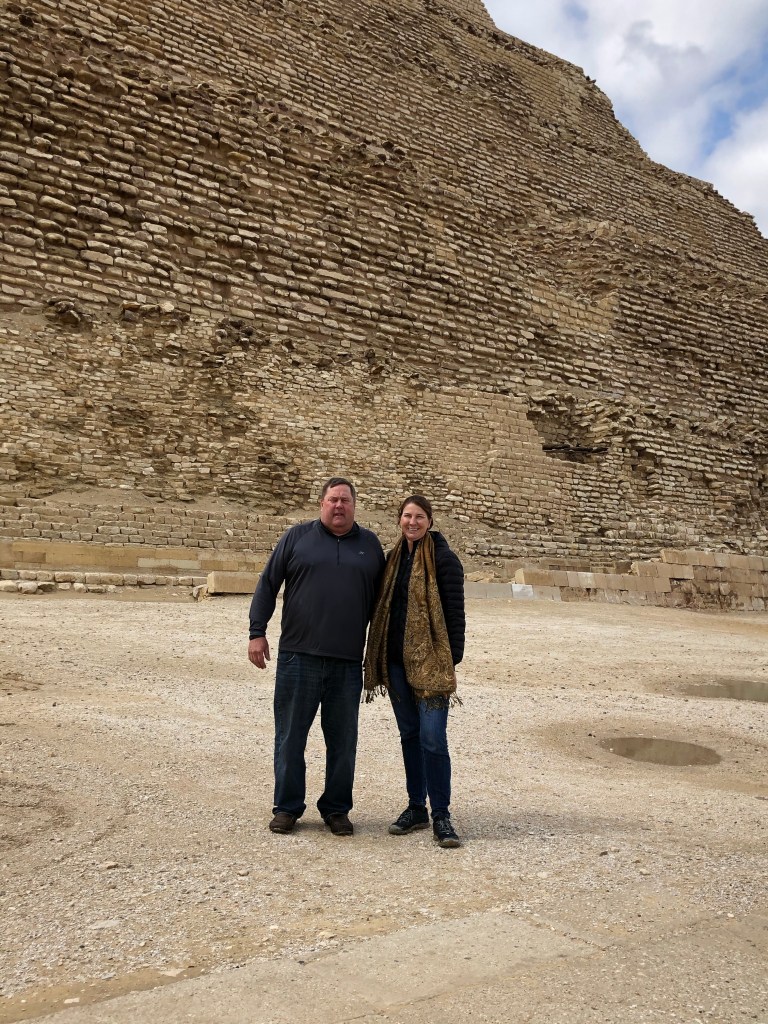 Driving around the floodwaters, our car is sideways in the street trying to get over to the shallow side. A view of the Giza pyramids from a distance the king’s pyramid is to the left, his son’s in the middle, and the queen’s on the right. The king’s pyramid is the biggest and tallest but from a far he made his son’s appear larger. This is the pyramid of the king’s son, here you can see the top still has the polished limestone covering which made the pyramids reflect the sun and moon light to appear white.These are two of the oldest pyramids in Egypt. The one in the background is the oldest. It’s built in a different style which was tombs built upon tombs. The pyramids range from small to giant sized blocks of stone to sand mounds on top of the tombs. In front of the oldest pyramid in Egypt. Notice no tourists anywhere!This location replicates in stone, the wood that was used prior to building pyramids with stone. These columns represent the reeds that were tied together to create the columns prior to the use of stone. Each tomb tells the story of the person that was buried there. One side of the column represents the person when they were alive (out of shape body, harsh facial features, etc) the other side represents what they will come back to the after life as. We were able to see the tune of a medical doctor and the hieroglyphics depicted circumcision and childbirth. Our guide said these were very rare depictions., the only that he is aware of. Descending under a pyramid. We were literally the only people in the pyramid, of course there was no electricity so we used our cell phones for light. Bonus we didn’t get electrocuted!