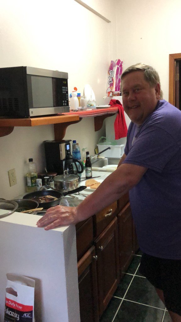 Our place, and I do mean our No one else is here the only others left on Saturday. Our new kitchen and Kirk doing what he does best!