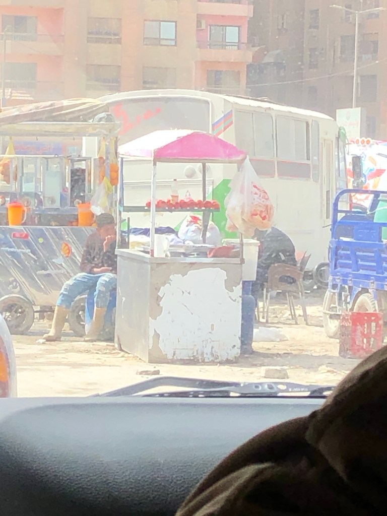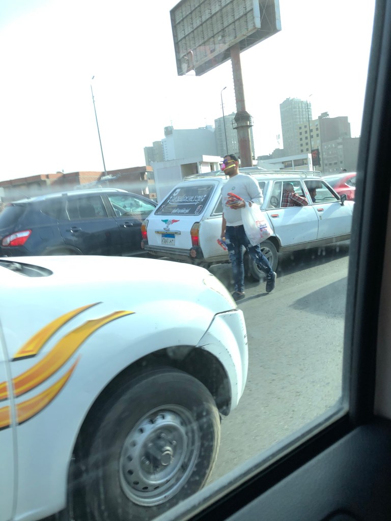 It’s very common to find several dogs together either eating or sleeping.This guy is selling fake funny glasses with a big nose, everybody needs that while they’re driving down the highway in Cairo!This is true our windshield and our driver is not slowing down!