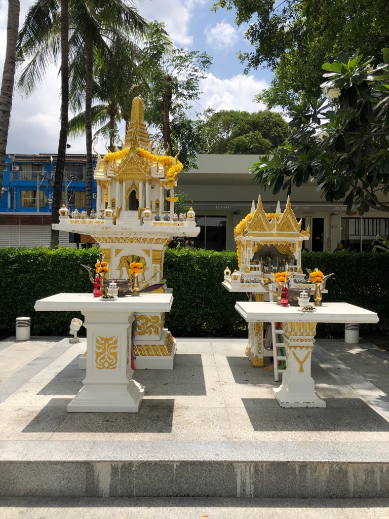 These spirit houses are shrines to the protective spirit of a place. The houses provide a shelter for spirits that could make things difficult if not appeased. Offerings of flowers, food and drink, usually red Fanta opened with a straw are made to keep the spirits happy. Source: Wikipedia.