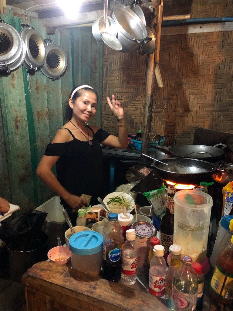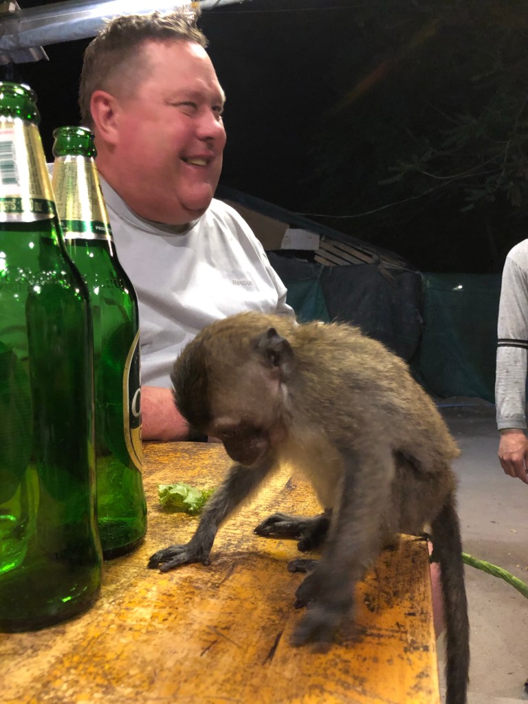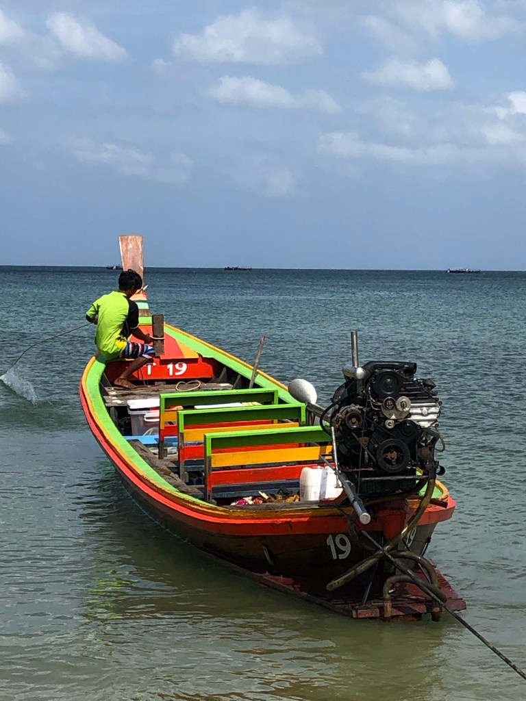 This ride was rough as the others, not quite as wet and pretty scary in the dark. We did get to see many fishing boats that had their platforms lit up with a green lights, it was too rough and too dark to take a good picture. The young gal behind us literally had a panic attack, thinking we were going too fast and going to die! Her terrified voice (even in German) didn’t help anybody else feel safe. I was doing pretty good until I saw the captain turn off the navigation devices so that the glare and light didn’t interfere with his line of sight into the darkness! Finally after about two hours we arrived at Koh Lipe which has a detached pier out in the Harbor, remember it’s still low tide. Here we had to transfer to long-tail boats amidst rough water, not OSHA approved ladders and with huge vertical steps from boat to dock necessary.