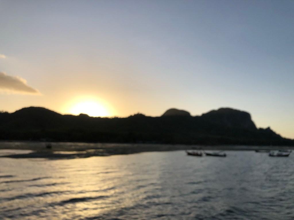 As they were backing away from the pier one of the three engines was taken out by something under the water that neared the surface as the tide lowered. It Nearly tore the engine right off. It took all of the crew and about five young guys from the boat to hoist the engine up with ropes. Then because of the damage we had to wait on another boat to come. This was another hour. We walked the LONG pier and found a place to buy a beer. It was a beautiful island and we were able to watch the sunset behind the mountains there. The sunset was amazing but not necessarily good as our next boat ride would be in the dark and these ferry boats are not really made to travel at night.